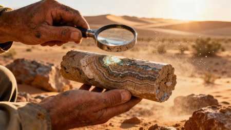 View of dirty explorer hands using a loupe to inspect multi-layered banded rock core, revealing mineral sheen in strong golden sunlight over a remote desert setting.