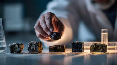 A geologist holding rock sample on laboratory table with core and test tubes conveying carbon storage research and analysis