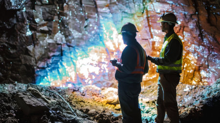 Mineral samples are being examined by a mining engineer in an underground mine. The engineer is attentive to details in a well-lit mining tunnel at work.