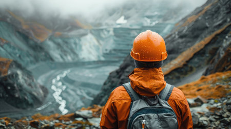 Surveying the copper mine, man in hard hat oversees operations at open pit - ensuring safety and efficiency in resource extraction