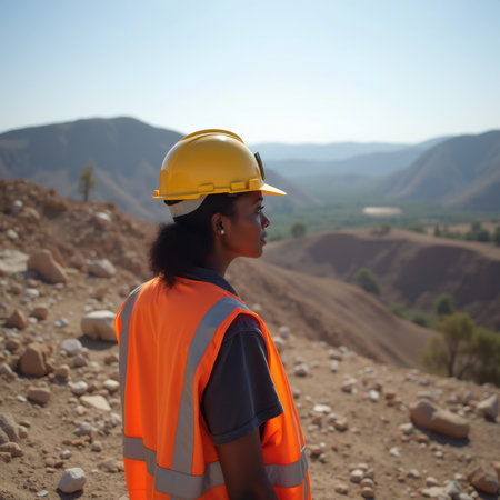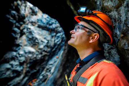 A mining engineer is focused on examining mineral samples in an underground tunnel, using tools to analyze the materials in a well-lit area. Protective gear enhances safety during the process.
