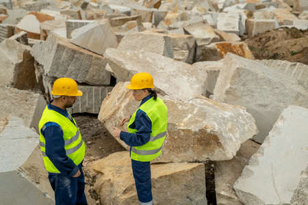 Two contemporary builders in workwear interacting between huge blocks at quarry