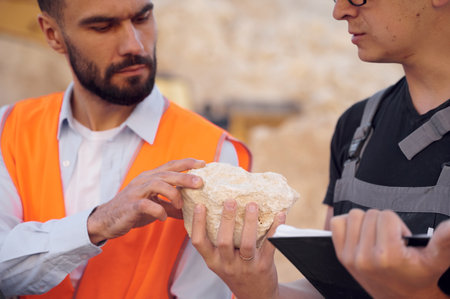 Checking rock that is in the hands. Two men in uniform are working together in the quarry.