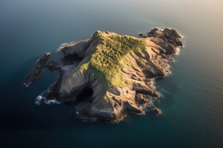 Top view of a rocky island with green trees in the sunlight