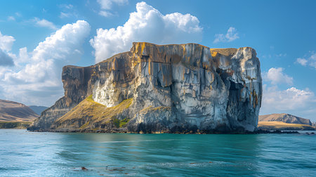 Waves gently lap against towering cliffs that rise majestically by the shore. Under clear blue skies, the tranquil water reflects the stunning landscape, inviting peace and exploration.