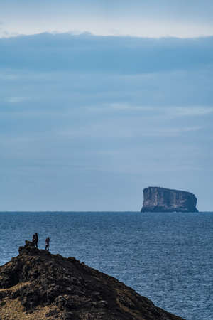 Tourists over the hill with huge islet in the background