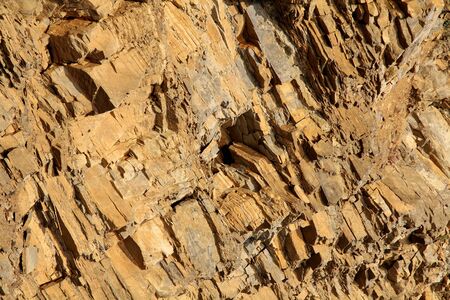 Close-up of rocky rock on a slice of a mountain. The concept of multi-million evolution and change of time periods. Archaeological concept. Background concept