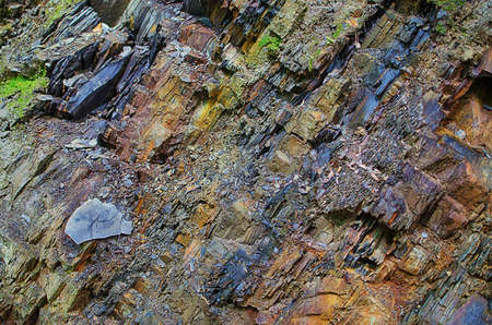 Natural stone wall. Rocky slate erosion background. Stone texture backdrop for design. Rock fragment closeup.