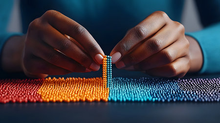 A close-up showcases hands layering colorful glass beads creatively, capturing focus and artistry. The background is dark, enhancing the beads' vivid colors and texture.
