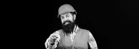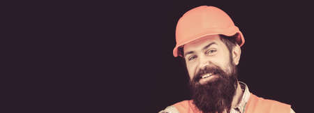 Man builders, industry. Builder in hard hat, foreman or repairman in the helmet. Portrait of a builder smiling. Bearded man worker with beard in building helmet or hard hat. Copy space