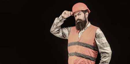 Builder in hard hat, foreman or repairman in the helmet. Bearded man worker in building helmet or hard hat. Portrait of a builder. Worker in construction uniform. Man builders, industry