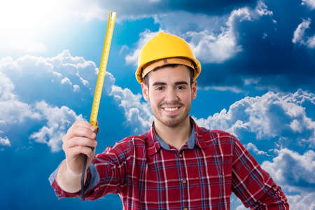 worker of the building smiling measuring with the metro