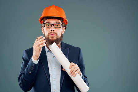 Male engineer wearing a suit in orange paint safety work drawings