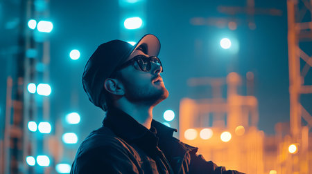 A young male engineer stands confidently in a neon-lit urban environment, wearing sunglasses and headphones, embodying modern tech culture amidst a vibrant city skyline.