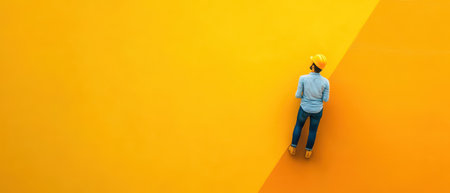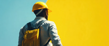 A construction worker in a yellow hard hat stands with a backpack gazing at a bright yellow wall under a clear blue sky.