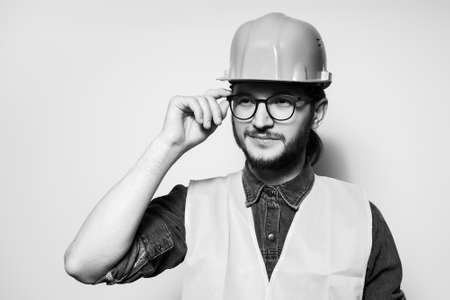 Black and white portrait of young confident construction worker.