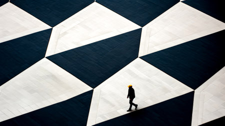 Man walking down street next to wall with pattern on it. Generative AI.