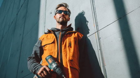 A confident construction worker wearing a safety vest stands against a modern building wall, showcasing strength and professionalism while holding a drill.