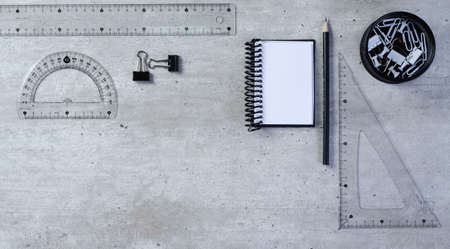 top view of a table with notepad, pencil, ruler, compass, square, paper clip and pins.