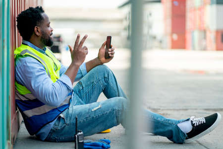 African American cargo container worker sit or lean to container tank also use mobile phone to contact friend during break or relax time with happiness.