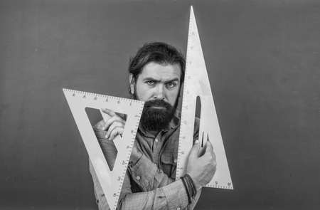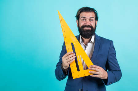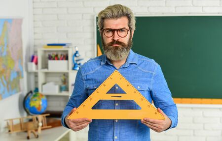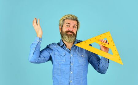 modern education concept. draw and measure. back to school. favorite subject and disciplines. Education at school. home learning concept. man teacher use triangle tool. bearded tutor man with ruler