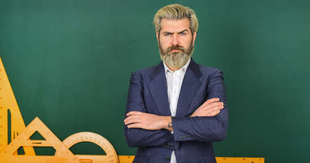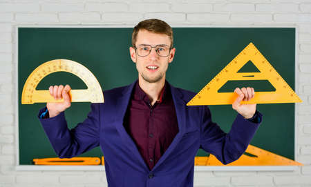 formal education. measure and size. serious teacher hold triangle and protractor tool. bearded man work in classroom with ruler. prepare for geometry exam. lecturer on math lesson. back to school