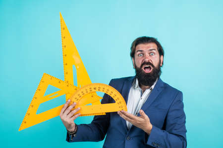 shocked mature teacher holding triangle and protractor tool. bearded man engineer work with ruler. prepare for geometry exam. architecht or lecturer on math lesson. back to school. measure and size