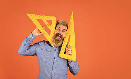 what angle you look. favorite subject and disciplines. Education at school. home learning concept. man teacher use triangle tool. bearded tutor man with ruler. draw and measure. back to school