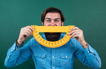 back to school. formal education. measure and size. happy mature teacher holding protractor tool. bearded man work in classroom with ruler. prepare for geometry exam. college lecturer on math lesson