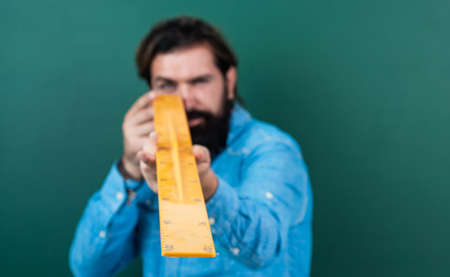 draw and measure. back to school. favorite subject and disciplines. Education at school. home learning concept. man teacher use triangle tool. bearded tutor man with ruler. copy space