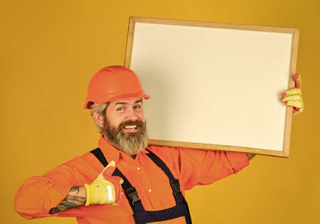 Visual outline. Troubleshoot concept. Bearded man repairman builder. Plan repair works. Repairman hold whiteboard copy space. Handsome repairman. Architect showing project. Professional repairman