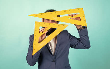precision measurement tool. man use triangle. math or mathematics. Stem education concept. study algebra at university. back to school. teacher of arithmetic. calculation and search of various data