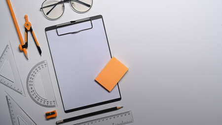 Top view clipboard, tape measure and stationery on white table.