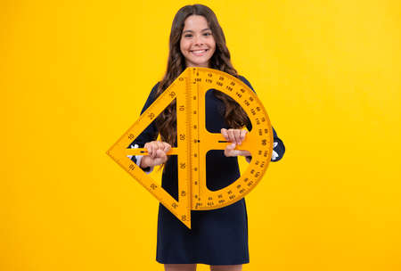 cheerful teen girl hold math triangle ruler in school on yellow background, education. Banner of school girl student. Schoolgirl pupil portrait with copy space.