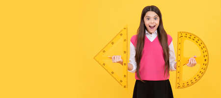 what angle you look. surprised child with triangle. teenage girl with ruler. Portrait of schoolgirl student, studio banner header. School child face, copyspace.