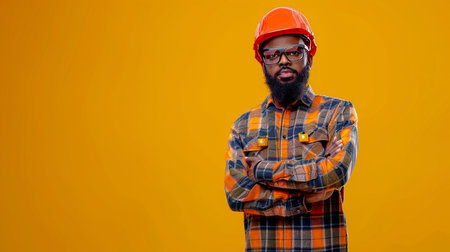 African-american male construction worker in orange hardhat and glasses on yellow background.