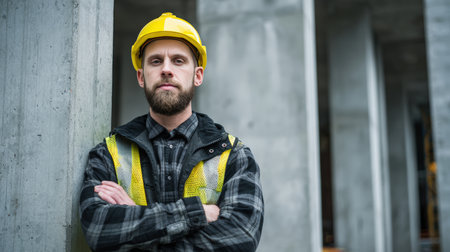 Confident Male Architect at Urban Construction Site with Concrete Columns