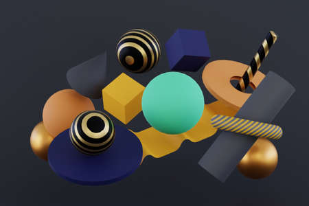 Colorful geometric figure on gray background. Floating shapes, elements. Concept of modern design and minimalist. 3D rendering