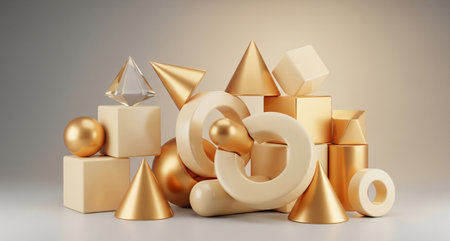 Abstract 3d rendering of golden geometric shapes in white studio background.