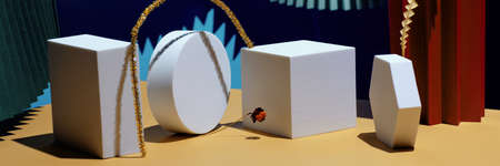 White podiums geometric shapes for presentations on a gold background. Top view, flat lay.