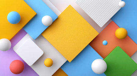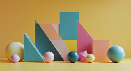 A vibrant arrangement of geometric paper shapes and colorful spheres on a softly colored background. Perfect for creative design projects and artistic inspirations.