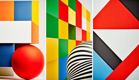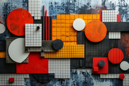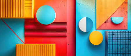 This vibrant image features a striking arrangement of geometric shapes in various colors on a bold split background, perfect for artistic themes and modern design projects.