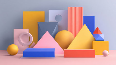Explore a vibrant arrangement of geometric shapes in soft pastel colors, perfect for creative backgrounds, design inspiration, or artistic projects.