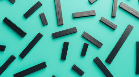 A vibrant and modern flatlay featuring black wooden blocks scattered across a bright turquoise background, creating an engaging abstract design.