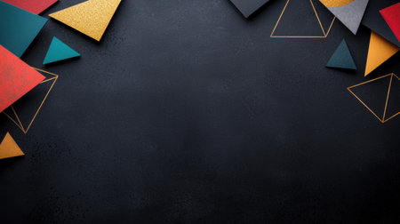 Vibrant triangle circle and line geometric shapes in a dynamic minimal and modern composition on a sleek black abstract background for editorial flyer design
