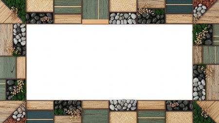 A rectangular frame is artfully constructed from wood, stones, moss, and dried flowers surrounding a blank white space.
