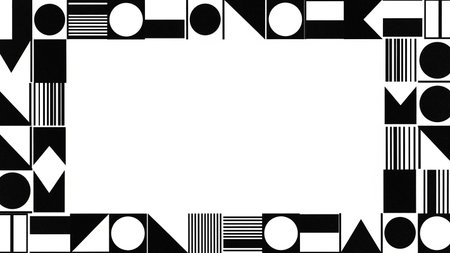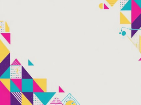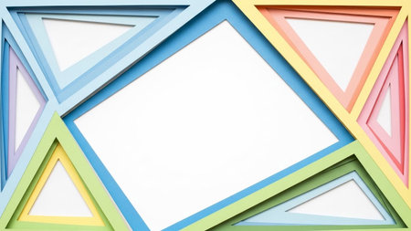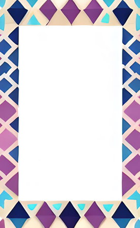 A geometric frame constructed from colorful square and triangle tiles in pastel shades surrounds a white central space.