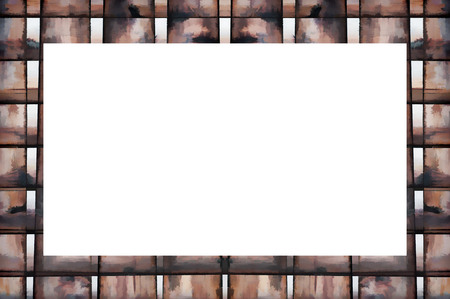 Empty wooden frame on multi-colored abstract paper background. Top view. Copy space. Selective focus.