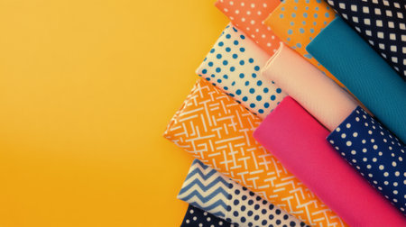 A vibrant display of rolled fabrics in various colors and patterns is set against a yellow background, showing the fabric's textures and hues, inviting creativity and inspiration.
