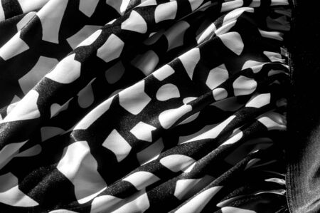 Texture, background, pattern. Women's silk dress dress. Silk fabric black and white in an abstract pattern, black white geometric shapes